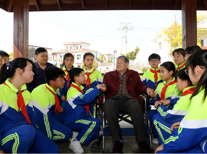 ▲3月28日,馬毛姐回到家鄉(xiāng)安徽省無為市劉渡鎮(zhèn)馬壩村,給家鄉(xiāng)的學(xué)生們講述當(dāng)年的戰(zhàn)斗經(jīng)歷。新華社發(fā)(鄭遠(yuǎn) 攝)