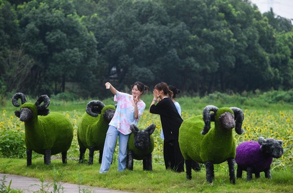 2021年8月10日,幾名游客在浙江湖州南山村特色度假小鎮(zhèn)的向日葵花田旁自拍留影。新華社記者 徐昱 攝
