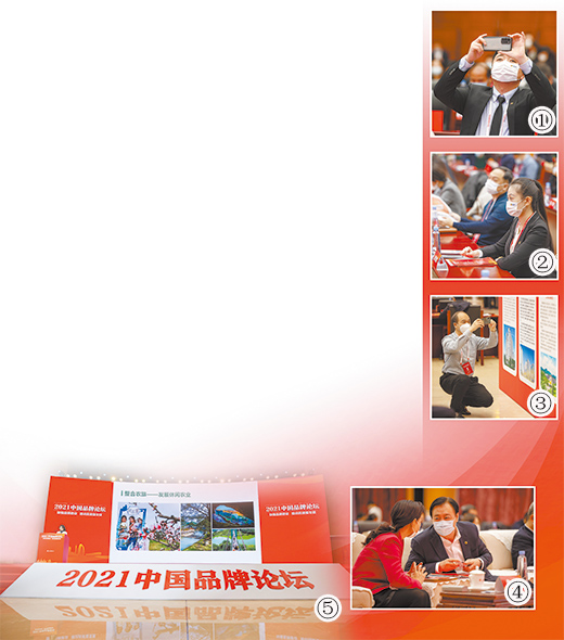 圖①、圖②、圖④:嘉賓在2021中國品牌論壇現(xiàn)場認(rèn)真聽會、熱烈討論。圖③:嘉賓拍攝會場內(nèi)的品牌風(fēng)采展板。圖⑤:嘉賓在2021中國品牌論壇品牌峰會上作主題演講。