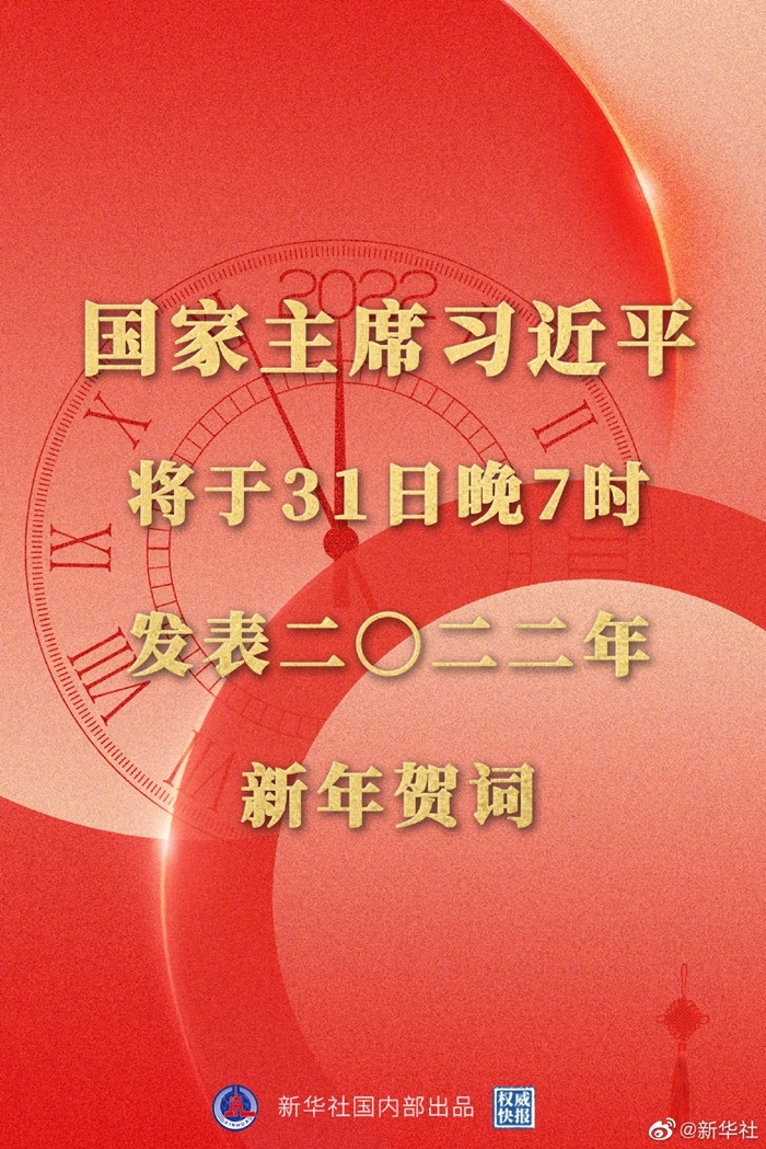 新華社北京12月30日電 國(guó)家主席習(xí)近平將于31日晚7時(shí)通過(guò)中央廣播電視總臺(tái)和互聯(lián)網(wǎng),發(fā)表二〇二二年新年賀詞。中央廣播電視總臺(tái)所屬中央電視臺(tái)綜合頻道、新聞?lì)l道、中文國(guó)際頻道、4K頻道,中國(guó)國(guó)際電視臺(tái)各外語(yǔ)頻道,中央人民廣播電臺(tái),中國(guó)國(guó)際廣播電臺(tái),以及人民網(wǎng)、新華網(wǎng)、央視新聞客戶(hù)端等中央主要新聞媒體所屬網(wǎng)站、新媒體平臺(tái)將準(zhǔn)時(shí)播出。