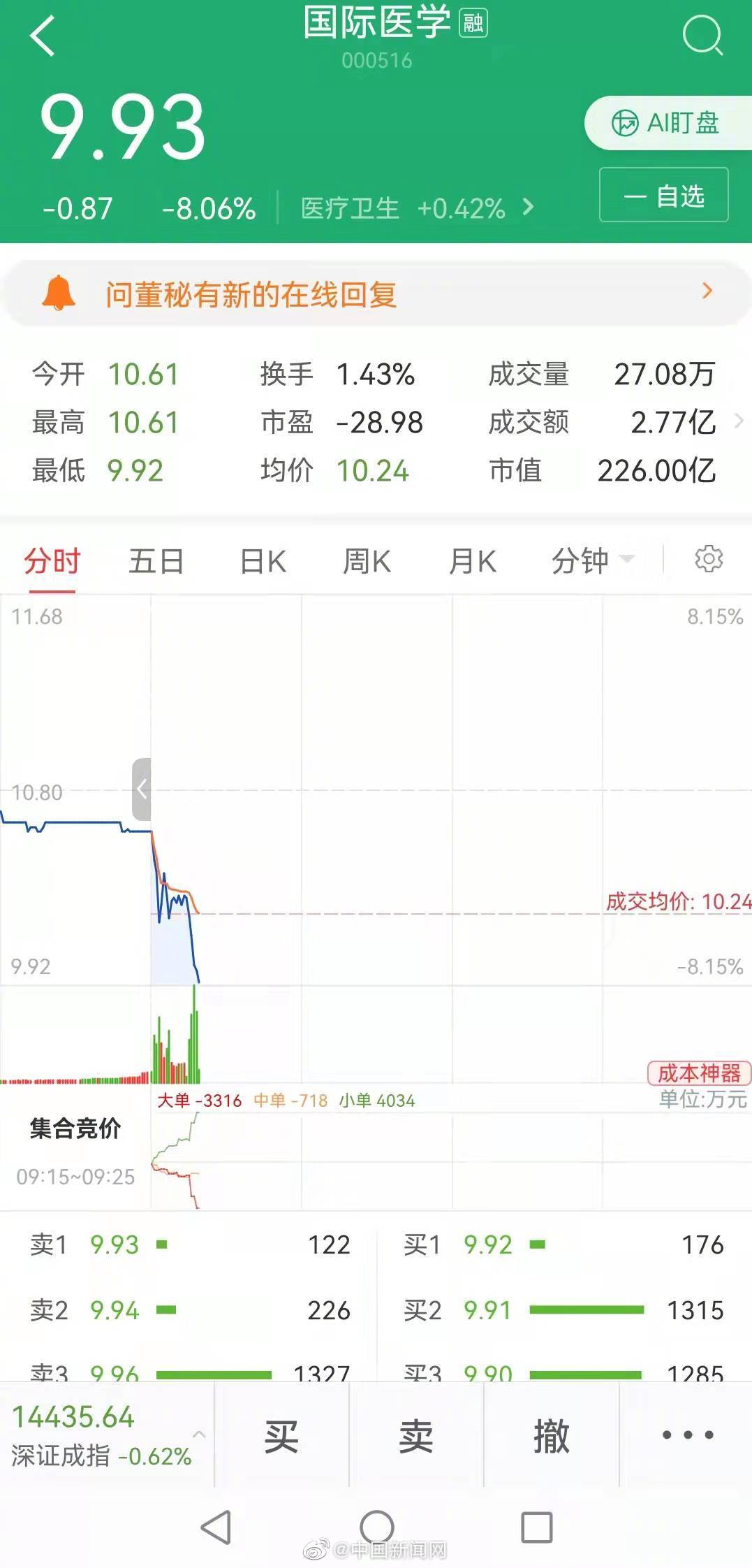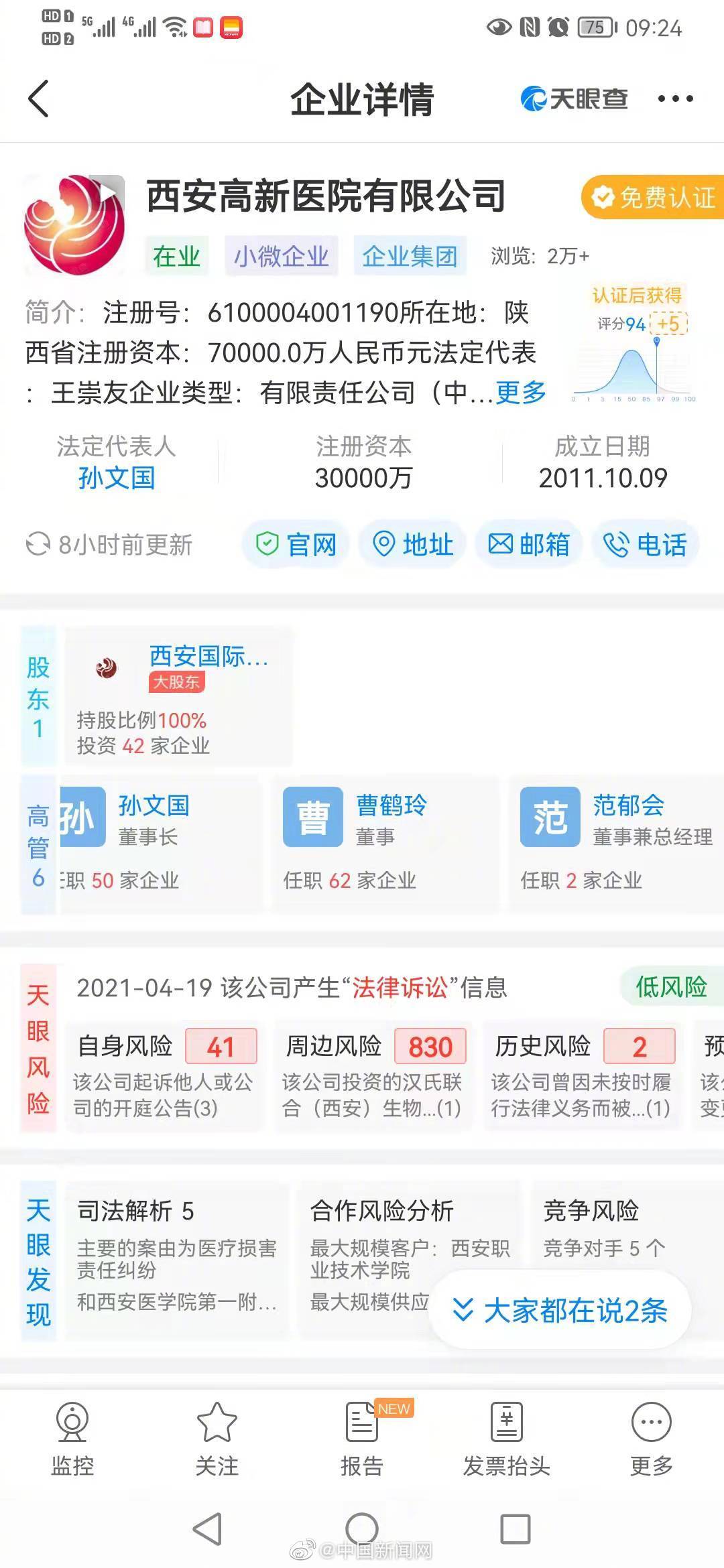 1月6日,西安孕婦流產事件相關責任人被處理,西安高新醫(yī)院總經理范郁會被停職。根據(jù)西安衛(wèi)健委官網(wǎng),西安高新醫(yī)院2011年經營性質由非營利性變更為營利性。據(jù)天眼查顯示,西安高新醫(yī)院有限公司是A股上市公司“國際醫(yī)學”的全資子公司。國際醫(yī)學的財報顯示,西安高新醫(yī)院是重要的營收及利潤來源。2020年度,西安高新醫(yī)院收入7.99億元,實現(xiàn)凈利潤6066.81萬元。截至發(fā)稿,國際醫(yī)學股價大跌,跌幅一度超8%。