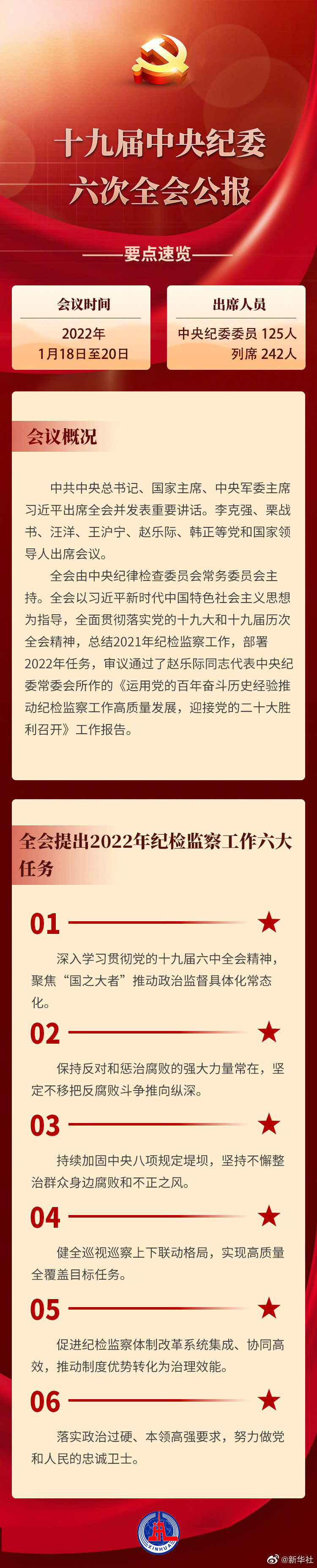 中國共產(chǎn)黨第十九屆中央紀(jì)律檢查委員會第六次全體會議,于2022年1月18日至20日在北京舉行。出席這次全會的有中央紀(jì)委委員125人,列席242人。