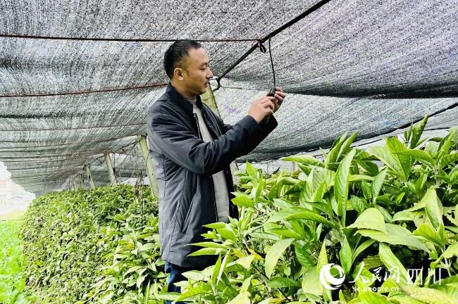 在大棚里調(diào)整噴灌設(shè)備、打理中藥材馬藍(lán)的高志波。人民網(wǎng) 朱虹攝