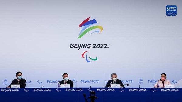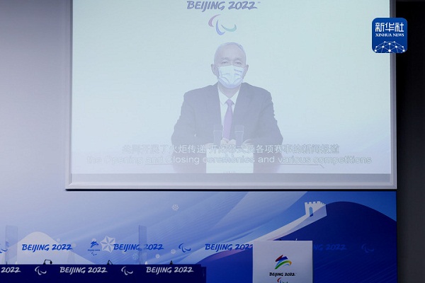 3月13日,北京冬奧組委主席蔡奇以視頻形式在發(fā)布會(huì)上發(fā)言。新華社記者許雅楠攝