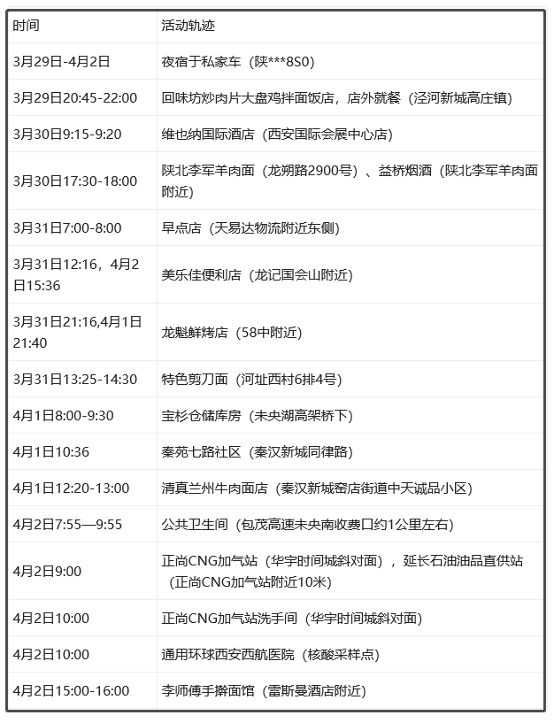 4月5日0-24時,西安市新增1例本土確診病例,袁某某,為4月3日確診病例宋某某的丈夫,其4月2日作為密切接觸者被集中隔離。4月2日-4日核酸檢測結(jié)果均為陰性,4月5日13時核酸檢測結(jié)果為陽性,5日17時經(jīng)市級專家組診斷為確診病例(輕型),根據(jù)流調(diào),已排查出的密接和次密接均按照有關(guān)要求落實隔離管控,其在集中隔離之前活動軌跡如下。