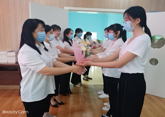 9月8日下午,園長王榮帶領(lǐng)園領(lǐng)導(dǎo)班子早早地等候在多功能廳門口,為每一位老師獻(xiàn)上一束鮮花,并送上誠摯的祝福,獻(xiàn)花過程中,每位老師都真切地感受到了園領(lǐng)導(dǎo)濃濃的情意。讓辛勤工作的老師們充分感受到了職業(yè)幸福感。