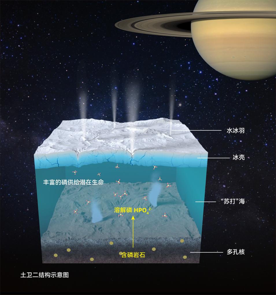 “磷只有溶于水才能被生物利用。與地球海水相比,土衛(wèi)二的海水含堿量高且沒有氧氣,成分有點(diǎn)像‘蘇打水’?!焙掠浫A說,他們發(fā)現(xiàn),在這種“蘇打水”環(huán)境中,土衛(wèi)二星核中的含磷巖石,只需要約10萬年就能向海水溶解出不少磷,而土衛(wèi)二的海洋已存在1億年以上,因此推斷其已含有豐富的磷。