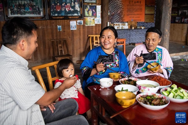 湖南省湘西土家族苗族自治州花垣縣雙龍鎮(zhèn)十八洞村一戶村民在吃午餐(2021年7月1日攝)。新華社記者陳思汗攝