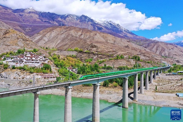 復(fù)興號(hào)列車行駛在西藏朗縣境內(nèi)(2022年4月14日攝)。新華社記者覺(jué)果攝