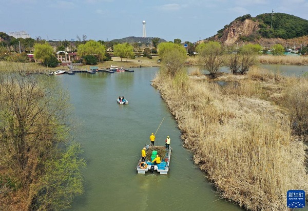 浙江省湖州市吳興區(qū)八里店鎮(zhèn)移沿山村河長(zhǎng)帶隊(duì)在移沿山村開(kāi)展巡河、保潔作業(yè)(2021年2月24日攝,無(wú)人機(jī)照片)。新華社記者翁忻旸攝