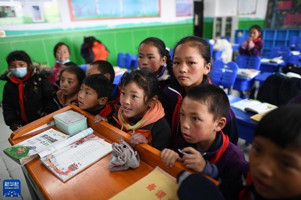 青海省果洛藏族自治州瑪多縣民族寄宿制中學(xué)二年級(jí)的學(xué)生在課間觀看多媒體課件(2021年3月26日攝)。該校采用清潔取暖方式后,學(xué)生的學(xué)習(xí)和生活環(huán)境大為改善。新華社記者張宏祥攝