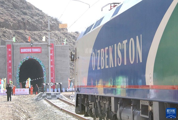 2016年2月27日,烏茲別克斯坦安格連-帕普鐵路卡姆奇克隧道全隧貫通。這是一列專列停在隧道進(jìn)口。新華社記者沙達(dá)提攝