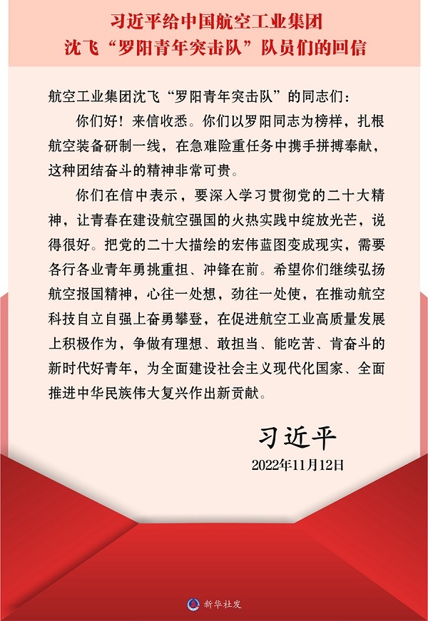 新華社北京11月13日電中共中央總書記、國家主席、中央軍委主席習(xí)近平11月12日給中國航空工業(yè)集團沈飛“羅陽青年突擊隊”的隊員們回信,勉勵他們學(xué)習(xí)貫徹好黨的二十大精神,為建設(shè)航空強國積極貢獻力量。