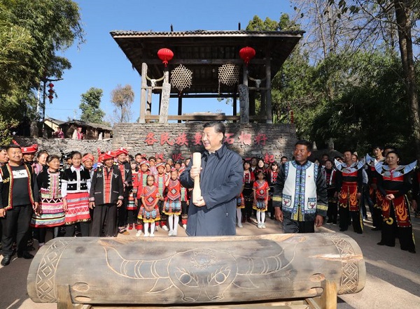 2020年1月19日下午,習(xí)近平總書記在云南省騰沖市清水鄉(xiāng)三家村中寨司莫拉佤族村廣場(chǎng)上,敲響三聲佤族木鼓,祝福來年風(fēng)調(diào)雨順、國泰民安。