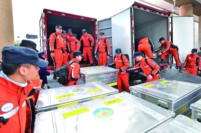 應土耳其政府請求,中國政府派遣中國救援隊赴土耳其實施震后國際救援。北京時間2月7日下午,中國救援隊乘國航包機從首都機場出發(fā)飛赴災區(qū)。圖為中國救援隊在搬運隨行設(shè)備和物資。新華社發(fā)