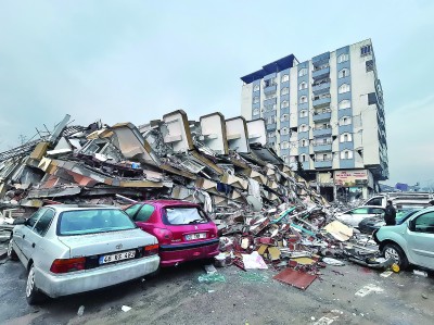 這是2月7日在土耳其卡赫拉曼馬拉什拍攝的一處因地震而倒塌的建筑。新華社發(fā)