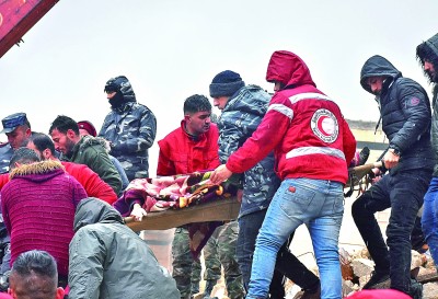 強震致敘利亞死傷嚴重,圖為2月6日人們在敘利亞哈馬省轉(zhuǎn)運傷者。 新華社發(fā)