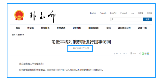 外交部官網(wǎng)顯示,該條消息于當(dāng)日15點整對外發(fā)布,而當(dāng)日外交部也舉行了例行記者會,為何不通過記者會宣布這一消息?外交無小事,細(xì)節(jié)就是信息。中國社會科學(xué)院俄羅斯東歐中亞研究所研究員李勇慧告訴記者,選擇整點專門公布體現(xiàn)了中方高度重視本次訪問,充分說明中俄關(guān)系的特殊性和重要性,選擇15點整發(fā)布也是考慮到俄羅斯時間是上午10點,中俄雙方外交部門一起為本次訪問做好準(zhǔn)備工作,表達(dá)了雙方齊心合力推動訪問成功的期待。