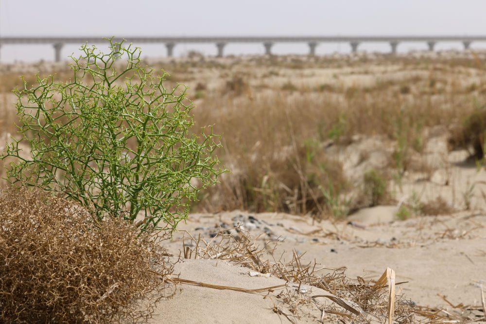 這是2022年5月19日拍攝的和若鐵路沿線種植的耐旱植物。新華社記者 丁磊 攝