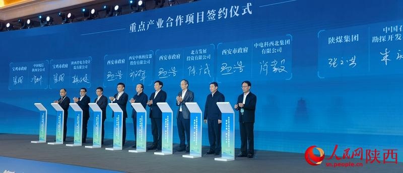 ▲“創(chuàng)新引領(lǐng) 深化合作”央企助力陜西高質(zhì)量發(fā)展推進(jìn)會(huì)現(xiàn)場,10個(gè)項(xiàng)目簽約,總投資額297億元。人民網(wǎng) 馬盛楠攝