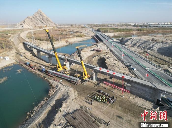 中新網(wǎng)新疆圖木舒克11月21日電 (高磊 陳明珠 徐凡) 11月21日,隨著夏可河跨河大橋最后一片T梁合攏,標(biāo)志著新疆生產(chǎn)建設(shè)兵團第三師圖木舒克市達(dá)坂山鐵路專用線項目路基工程全線貫通。