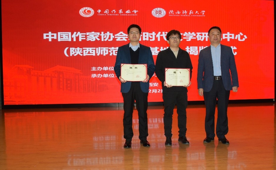 ▲盧勝利為中國作協(xié)新時代文學(xué)研究中心(陜西師范大學(xué)基地)主任崔慶蕾、楊輝頒發(fā)聘書