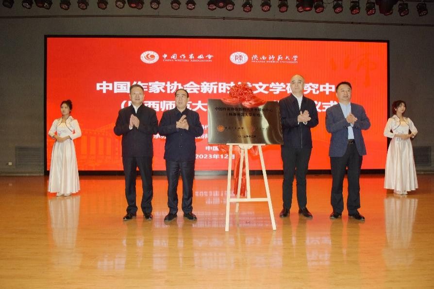 ▲吳義勤、武勇超、賈平凹、盧勝利為中國作協(xié)新時代文學(xué)研究中心(陜西師范大學(xué)基地)揭牌