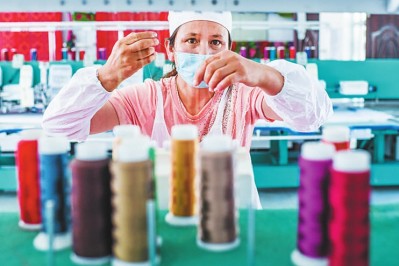 在新疆特克斯縣也什克勒克村刺繡合作社,村民在制作紡織品。新華社發(fā)