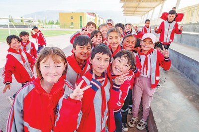 新疆塔什庫(kù)爾干塔吉克自治縣城鄉(xiāng)寄宿制小學(xué)學(xué)生在課外活動(dòng)時(shí)合影。新華社發(fā)