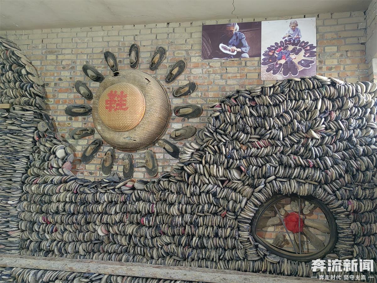 在民俗博物館,有一面“萬鞋墻”引人注目,成千上萬雙穿用過、作廢了的破舊鞋子,如幾何圖形般擺成了一地一墻的花壇浮雕,記錄著陜北人在山峁高梁行走的千辛萬苦。