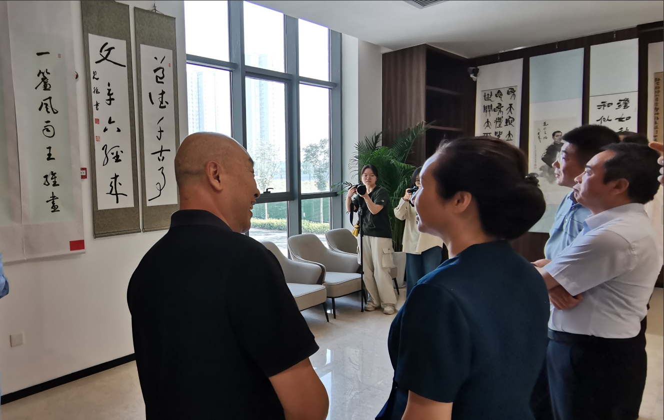 ▲陜西省社會(huì)科學(xué)院書(shū)畫(huà)藝術(shù)中心副主任、秘書(shū)長(zhǎng)牛涇民(左一)向涇陽(yáng)縣委宣傳部部長(zhǎng)徐曉玲(左二)、縣紀(jì)委書(shū)記(監(jiān)委主任)譚會(huì)黨(右一)、縣文聯(lián)黨組書(shū)記(主席)姚海濱(右二)介紹參展作品。