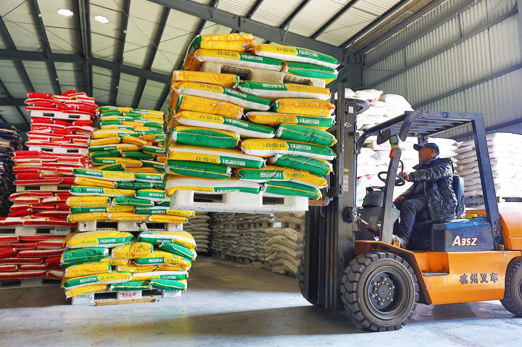 2023年2月15日,在浙江義烏供銷聯(lián)社的農(nóng)資貯存?zhèn)}庫,工作人員正在調(diào)運復合肥料等農(nóng)資。