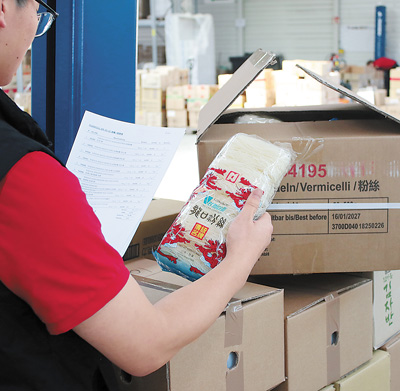 圖為東方超市員工在清點(diǎn)剛運(yùn)抵貨運(yùn)中心的龍口粉絲。作為中國最早與歐盟互認(rèn)的地理標(biāo)志產(chǎn)品之一,龍口粉絲一直深受德國顧客的青睞。圖為本報歐洲中心分社肖晶攝