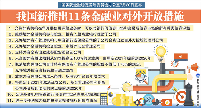 新華社北京7月20日電(記者吳雨)國務(wù)院金融穩(wěn)定發(fā)展委員會辦公室20日對外宣布,為貫徹落實黨中央、國務(wù)院關(guān)于進一步擴大對外開放的決策部署,按照“宜快不宜慢、宜早不宜遲”的原則,在深入研究評估的基礎(chǔ)上,推出以下11條金融業(yè)對外開放措施: