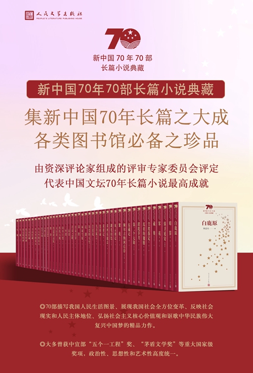為慶祝中華人民共和國(guó)成立70周年,全面展現(xiàn)中華民族的文化創(chuàng)造力和新中國(guó)文學(xué)發(fā)展水平,人民文學(xué)出版社、學(xué)習(xí)出版社聯(lián)合8家出版社,聯(lián)合推出“新中國(guó)70年70部長(zhǎng)篇小說典藏”叢書。這套叢書收錄了從1949年至今,描寫我國(guó)人民生活圖景、展現(xiàn)我國(guó)社會(huì)全方位變革、反映社會(huì)現(xiàn)實(shí)和人民主體地位、弘揚(yáng)社會(huì)主義核心價(jià)值觀和謳歌中華民族偉大復(fù)興中國(guó)夢(mèng)的70部原創(chuàng)長(zhǎng)篇小說精品力作。