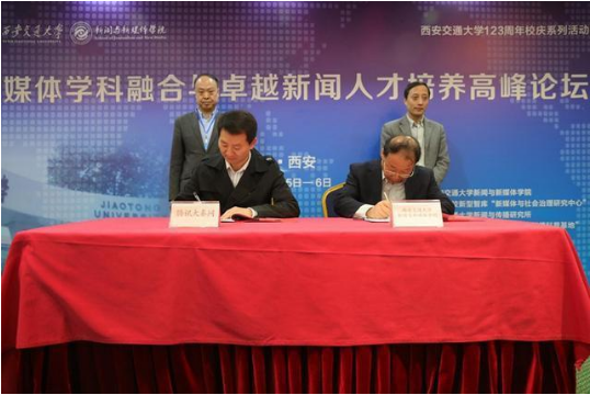 開幕式之后,西安交通大學(xué)新聞與新媒體學(xué)院院長助理張宏邦主持了校企合作簽約和揭牌儀式。西安交通大學(xué)新聞與新媒體學(xué)院院長李明德與天脈聚源電視新聞大數(shù)據(jù)中心負(fù)責(zé)人王濤簽約共建“陜西省智媒研究基地”。西安交通大學(xué)新聞與新媒體學(xué)院院長李明德與騰訊大秦網(wǎng)總裁賀柯簽約共建“陜西企鵝新媒體學(xué)院”。西安交通大學(xué)新聞與新媒體學(xué)院院長李明德與北京華晟經(jīng)世信息技術(shù)有限公司高級(jí)副總裁楊建共同為“新媒體智慧學(xué)習(xí)工場(chǎng)”揭牌。(中國日?qǐng)?bào)陜西記者站)