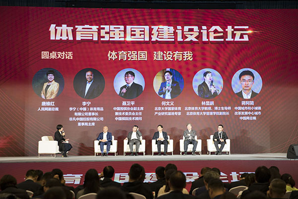 隨后進行的兩場圓桌對話更是精彩紛呈。首場圓桌論壇以“體育強國 建設有我”為主題,由人民網(wǎng)副總裁唐維紅主持。李寧(中國)體育用品有限公司董事長、非凡中國控股有限公司董事局主席李寧,中國圍棋協(xié)會副主席、“棋圣”聶衛(wèi)平,北京大學國家體育產(chǎn)業(yè)研究基地專家何文義,北京體育大學教授、博士生導師、管理學院副院長林顯鵬,中國城市和小城鎮(zhèn)改革發(fā)展中心城市中國網(wǎng)總編輯蔣阿簡等嘉賓參與討論。他們分別就全民健身如何促進全民健康,體育消費如何激活體育產(chǎn)業(yè),傳統(tǒng)運動如何繁榮體育文化以及體育場地設施建設與城市體育發(fā)展關系等話題交流探討,為各級黨委、政府、社會機構等多層次社會力量參與中國體育產(chǎn)業(yè)轉(zhuǎn)型升級進程,促進體育產(chǎn)業(yè)的規(guī)?;l(fā)展,更好地建設體育強國提供“精神食糧”。