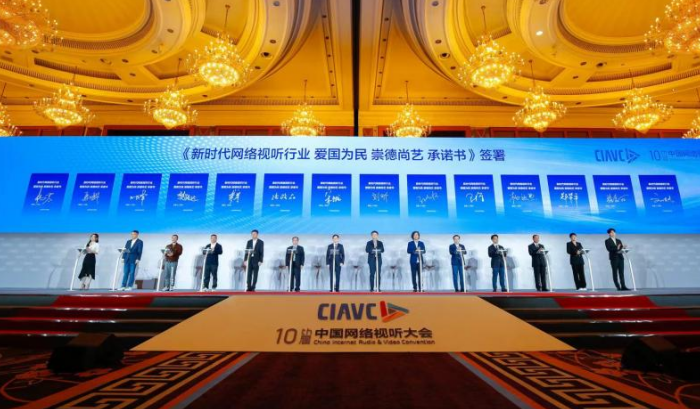 隨后,4位演藝代表與來自咪咕、中國(guó)廣電、芒果、華數(shù)、阿里文娛、騰訊、愛奇藝、快手、嗶哩嗶哩、笑果等平臺(tái)代表共同完成倡議書的簽署儀式。