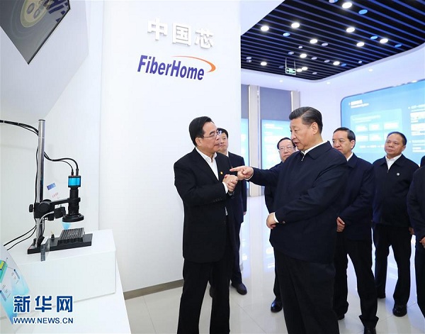 26日上午,習(xí)近平先后來到位于東湖高新區(qū)的烽火科技集團(tuán)和武漢新芯集成電路制造有限公司,考察企業(yè)創(chuàng)新發(fā)展情況。東湖高新區(qū)是首批國(guó)家級(jí)高新區(qū),2016年獲批中國(guó)(湖北)自由貿(mào)易試驗(yàn)區(qū)武漢片區(qū)。這里是全球最大的光通信研發(fā)生產(chǎn)基地,被譽(yù)為“中國(guó)光谷”。在烽火科技集團(tuán),習(xí)近平聽取武漢市新舊動(dòng)能轉(zhuǎn)換發(fā)展情況匯報(bào),察看企業(yè)自主創(chuàng)新成果展示,了解企業(yè)優(yōu)化調(diào)整產(chǎn)業(yè)結(jié)構(gòu)和加強(qiáng)黨建工作等情況。展廳里陳列著烽火科技集團(tuán)以及長(zhǎng)飛光纖光纜股份有限公司研制的芯片、光纖等高科技產(chǎn)品。習(xí)近平一邊察看實(shí)物一邊了解產(chǎn)品用途、性能、國(guó)產(chǎn)化率、在國(guó)際同行業(yè)中的地位等情況。聽到介紹烽火科技在“超大容量、超長(zhǎng)距離、超高速率”光通信領(lǐng)域的研發(fā)和生產(chǎn)處于世界領(lǐng)先地位,一根光纖上可實(shí)現(xiàn)67.5億對(duì)人同時(shí)通話,總書記點(diǎn)頭表示贊許。他語重心長(zhǎng)對(duì)企業(yè)負(fù)責(zé)人說,新發(fā)展理念,創(chuàng)新是第一位的。我國(guó)已經(jīng)成為世界第二大經(jīng)濟(jì)體,過去那種主要依靠資源要素投入推動(dòng)經(jīng)濟(jì)增長(zhǎng)的方式行不通了,必須依靠創(chuàng)新。具有自主知識(shí)產(chǎn)權(quán)的核心技術(shù),是企業(yè)的“命門”所在。企業(yè)必須在核心技術(shù)上不斷實(shí)現(xiàn)突破,掌握更多具有自主知識(shí)產(chǎn)權(quán)的關(guān)鍵技術(shù),掌控產(chǎn)業(yè)發(fā)展主導(dǎo)權(quán)。國(guó)家需要你們?cè)谶@方面加快步伐。他要求企業(yè)加強(qiáng)黨建工作,以黨建引領(lǐng)促進(jìn)企業(yè)創(chuàng)新發(fā)展。