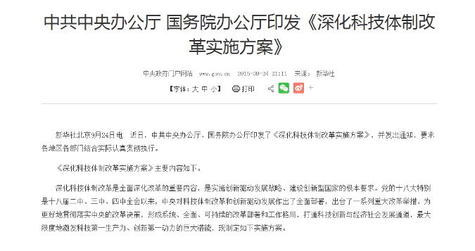不過,要指出的是,高層對科技發(fā)展的部署早就已經(jīng)展開了,比如2015年9月中辦、國辦一連下發(fā)了兩個文件。