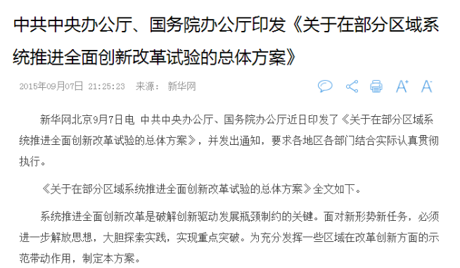 先是印發(fā)了《關(guān)于在部分區(qū)域系統(tǒng)推進全面創(chuàng)新改革試驗的總體方案》。