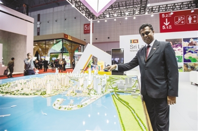 2018年11月6日,在上海舉行的首屆中國(guó)國(guó)際進(jìn)口博覽會(huì)上,斯里蘭卡館的工作人員通過沙盤模型向觀眾介紹正在建設(shè)的科倫坡港口城,該項(xiàng)目是中斯兩國(guó)在“一帶一路”建設(shè)中的重點(diǎn)合作項(xiàng)目。影像中國(guó)