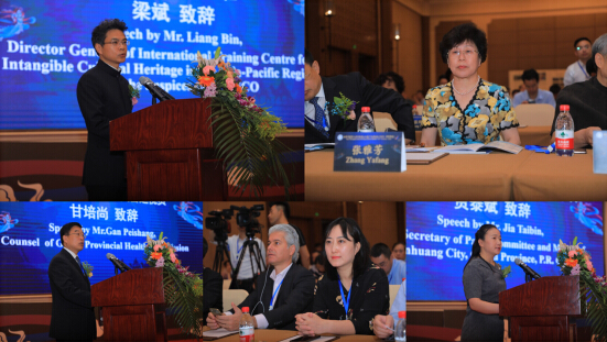 上圖為聯(lián)合國(guó)教科文組織亞太地區(qū)非物質(zhì)文化遺產(chǎn)國(guó)際培訓(xùn)中心梁斌主任出席會(huì)議并致辭(左上圖);中國(guó)非遺保護(hù)協(xié)會(huì)常務(wù)副會(huì)長(zhǎng)兼秘書(shū)長(zhǎng)、原文化部人事司司長(zhǎng)張雅芳出席會(huì)議并致辭(右上圖);中國(guó)甘肅省衛(wèi)生健康委員會(huì)巡視員甘培尚出席會(huì)議并致辭(左下圖);中國(guó)教育部中外人文交流中心李婷婷處長(zhǎng)(右)代表杜柯偉主任致辭(下中圖);中國(guó)敦煌市副市長(zhǎng)牛艷紅代表市長(zhǎng)賈泰斌致辭(右下圖)。