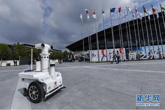 這是互聯(lián)網(wǎng)之光博覽會(huì)場(chǎng)館外巡邏的5G警用機(jī)器人(10月18日攝)。 新華社記者 徐昱 攝