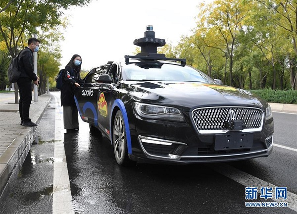 市民在北京市海淀區(qū)稻香湖路的百度自動(dòng)駕駛出租車指定上車點(diǎn)乘車(10月14日攝)。新華社記者 任超 攝