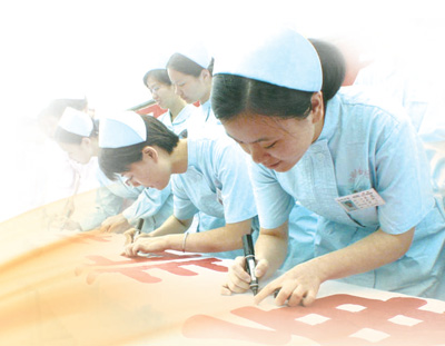 2003年5月12日,福州市屬醫(yī)院的護士在條幅上簽名,表達戰(zhàn)勝非典的決心。楊婀娜攝(人民視覺)
