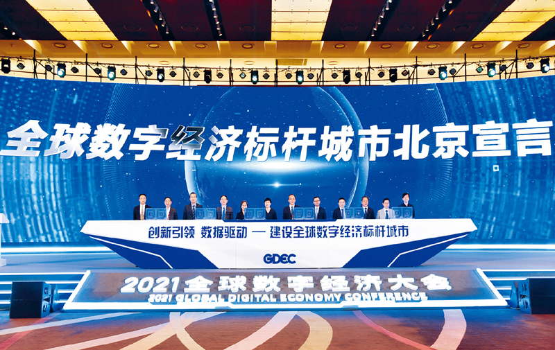 2021年8月2日,2021全球數(shù)字經(jīng)濟(jì)大會(huì)在北京國(guó)家會(huì)議中心舉行。圖為《全球數(shù)字經(jīng)濟(jì)標(biāo)桿城市北京宣言》在大會(huì)主論壇上發(fā)布。 中新社發(fā) 2021全球數(shù)字經(jīng)濟(jì)大會(huì)供圖