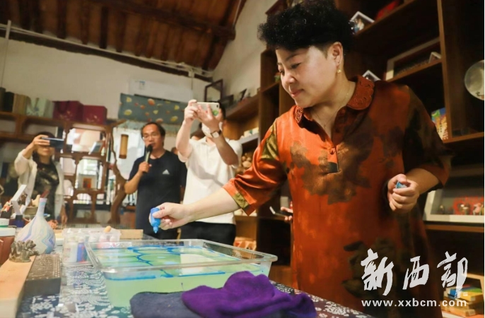 在裝滿事先調(diào)配好水溶液的容器中滴入顏料,使它在水中自然暈染開(kāi);接著使用自制的工具在其上描繪出各式各樣美麗的紋理,最后將其轉(zhuǎn)印到扇面上……這樣,就完成了一副美麗的團(tuán)扇。這是非遺傳承人張雙敏在展示名為“唐流彩”的非遺技藝。從藝三十余年,張雙敏拜師學(xué)藝、精深鉆研,參加了各項(xiàng)非遺以及文化主題活動(dòng),她為大唐不夜城繪畫(huà)的“花舞大唐”紋樣還申請(qǐng)了專利,唐流彩這項(xiàng)傳統(tǒng)技藝在中華大地再次綻放。