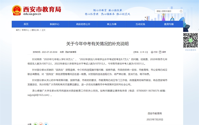 西安市教育局于7月20日發(fā)布的補充說明。官網(wǎng)截圖
