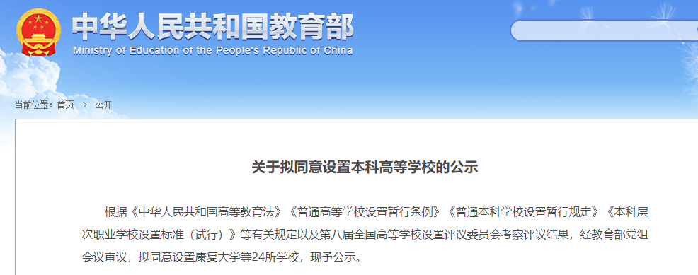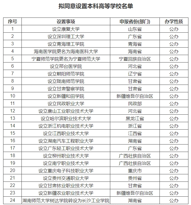 根據(jù)《中華人民共和國(guó)高等教育法》《普通高等學(xué)校設(shè)置暫行條例》《普通本科學(xué)校設(shè)置暫行規(guī)定》《本科層次職業(yè)學(xué)校設(shè)置標(biāo)準(zhǔn)(試行)》等有關(guān)規(guī)定以及第八屆全國(guó)高等學(xué)校設(shè)置評(píng)議委員會(huì)考察評(píng)議結(jié)果,經(jīng)教育部黨組會(huì)議審議,擬同意設(shè)置康復(fù)大學(xué)等24所學(xué)校,公示名單如下: